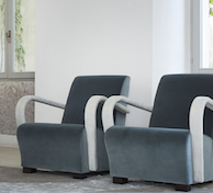 Modern designer armchair with a retro flair, which reminds the famous Italian art deco period.Curved arms and solid seat and back. This armchair is available in different fabrics options and leather. You can combine this lovely modern armchair with our modern sofas with same fabrics or leather.