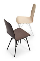 A sleek designer dining room chair. Have the option to buy the base in solid beech wood in different finishes or powder coated steel in different colors. The seat and back can be made of a whole curved plywood plank or upholstered in fabric, faux leather or real leather. The metal base can be made in white, gray, moka or cyan color. This chair with a curved solid beech wood or upholstered in fabric or leather.