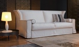 Design: U. Cifarelli & R. Picello. This is a sofabed which distances itself from the usual rigorous lines of our sofabeds collection. This sofa bed has all the feature of a living room sofa : its seat cushions are a mix of down feathers and polyurethane foam at different densities while the back cushions are filled with down feathers and the back cushions are supported by a headrest which can be lifted. Available in sectional composition by adding chaise lounges or corner elements. The bed mechanism has large wood slats and it is very easy to open.