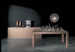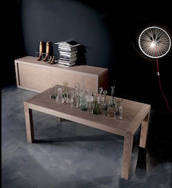 Modern dining table with sculptural details with solid legs which connect to the solid wood top externally creating a geometrical effect. Available in many different modern wood finishes, in fix or extendible version. There is one extension of 24" for each version available in matt lacquer finish.