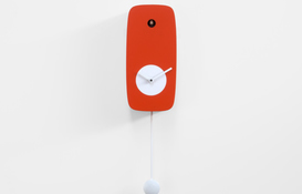 Design: S. Scaranello. A humorous clock seems to take inspiration from cartoons, a table top cuckoo clock shape into the cutest little bird house complete with a chimney! Made of wood it can be ordered in orange and white or red and white or green and white. The cuckoo can be sent on high,low or off volume and thanks to a light sensor the cuckoo stays quiet at night. Battery feeding. Size: 9.4" x 9.4" x 4"d