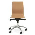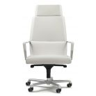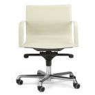 Modern designer chair fully covered with leather, including armrests. You can see the beautiful stitching running along the edges of the armrests and chairs. This modern office armchair is made in two versions with standard back and higher back, each is also available in "comfort" version with added padding for more comfort. The base available in bright chrome, liquid aluminum, semi bright black. Gas seat height adjustment and tilt control mechanism (basic Synchro). Available in hide leather in 30 different colors and the softest full grain leather in 30 different colors.