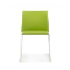 Simple dining chair with a distinctive design with a sled base and steel frame in round section 12 mm diameter. Underseat with woven elastic belts or metal seat pan high tech fabric covered. The legs are available in bright chrome finish, liquid aluminum, semi bright black or glossy white. Hide leather seat and back available in 30 different colors with visible stitching. The collection also includes chair with upholstered leather arms and a large armless lounge chair.